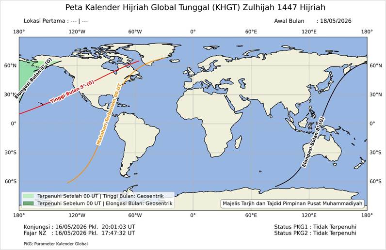 Sedangkan untuk Zulhijah 1447 H seperti pada Gambar 4 menunjukkan adanya area berwarna hijau muda atau titik-titik koordinat yang memenuhi kriteria atau ketinggian minimal 5° dan elongasi minimal 8°, dan pada area hijau muda ada yang berada di daratan Amerika, namun PKG-2 tidak terpenuhi dikarenakan waktu konjungsi terjadi setelah waktu fajar di New Zealand. Waktu konjungsi terjadi pada pkl. 20:01:03 UTC pada tanggal 16 Mei 2026 M dan waktu fajar di New Zealand terjadi pada pkl. 17:47:32 UTC pada 16 Mei 2026 M, atau waktu konjungsi terjadi 2 jam 13 menit 31 detik setelah waktu fajar di New Zealand, sehingga PKG-2 tidak terpenuhi dan secara otomatis PKG-1 juga tidak terpenuhi.