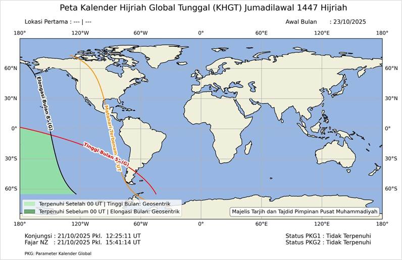 Pada Gambar 3 menunjukkan adanya area berwarna hijau muda, atau ada titik-titik koordinat yang memenuhi kriteria atau ketinggian minimal 5° dan elongasi minimal 8° dan waktu konjungsi yaitu pkl. 12:25:11 UTC tanggal 21 Oktober 2025 terjadi sebelum waktu fajar di New Zealand yaitu pkl. 15:41:14 UTC tanggal 21 Oktober 2025, atau konjungsi terjadi 3 jam 16 menit 3 detik sebelum waktu fajar di New Zeland, tetapi karena area hijau muda atau titik koordinat yang memenuhi kriteria tidak ada satupun yang berada di daratan Amerika, maka PKG-2 tidak terpenuhi yang secara otomatis juga PKG-1 tidak terpenuhi.