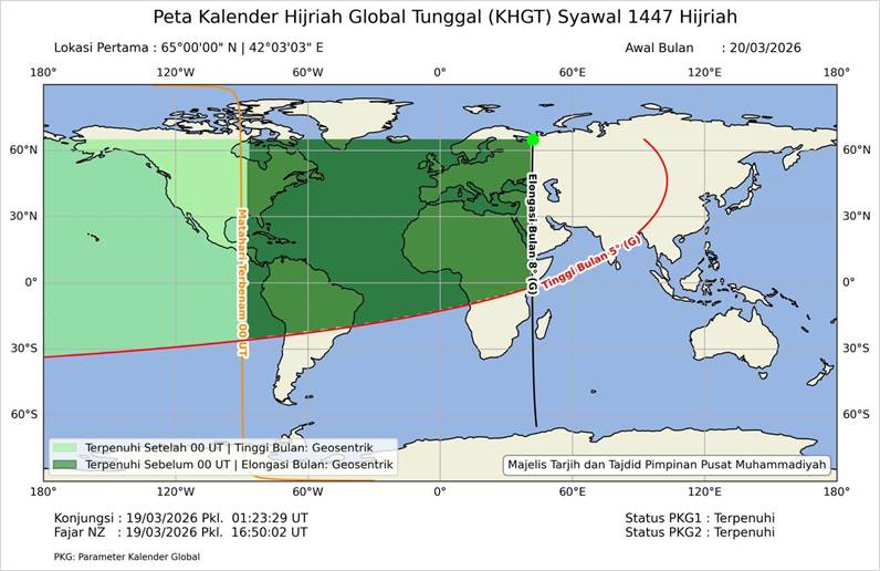 Untuk menggambarkan penentuan bulan hijriah menurut KHGT yang memenuhi PKG-1, yaitu telah terpenuhinya ketinggian minimal 5° dan elongasi minimal 8° dimanapun, sebelum pkl. 00:00 UTC pada tanggal terjadinya konjungsi, dapat dilihat pada penentuan Syawal 1447 H seperti yang ditunjukkan oleh Gambar 2 yang menunjukkan lokasi atau titik koordinat pertama yang memenuhi kriteria yaitu di 65°00’00” Lintang Utara dan 42°03’03” Bujur Timur, dan kriteria ketinggian minimal 5° dan elongasi minimal 8° terjadi di titik koordinat tersebut sebelum pkl. 00:00 UTC, sehingga statu PKG-1 terpenuhi yang juga secara otomatis PKG-2 terpenuhi juga.