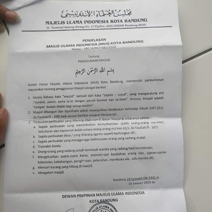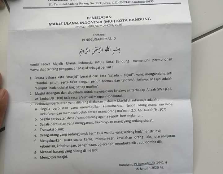 Majelis Ulama Indonesia (MUI) kecamatan Bandung Wetan mengeluarkan fatwa kontroversial mengenai “Penggunaan Masjid” Nomor 480/A/MUI-KB/I/2020. Fatwa ini langsung menjadi perbincangan di media social. Karena berisi himbauan untuk “memungsikan masjid-masjid” sebagai tempat ibadah.