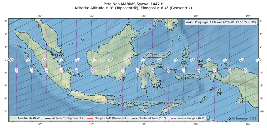 Menurut Neo-MABIMS konjungsi terjadi pada pkl. 01:22:55.74 UTC tanggal 19 Maret 2026 M, untuk seluruh wilayah Negara Kesatuan Republik Indonesia (NKRI) tidak ada satupun wilayah yang memenuhi kriteria minimal altitude toposentrik 3° dan elongasi geosentrik minimal 6.4°. Di bagian ujung paling barat Indonesia, altitudenya sekitar kurang dari 3° sedangkan elongasinya adalah lebih dari 6.19° dan kurang dari batas minimal yaitu 6.4°. Dengan tidak adanya satupun daerah di NKRI yang memenuhi kriteria Neo-MABIMS, maka menurut prediski 1 Syawal 1447 H menurut Neo-MABIMS jatuh pada tanggal 21 Maret 2026 M. Walau penetapan untuk 1 Syawal 1447 H tetap mengacu dan menunggu keputusan siding isbat yang akan digelar oleh Kementerian Agama RI pada tanggal 19 Maret 2026 M.