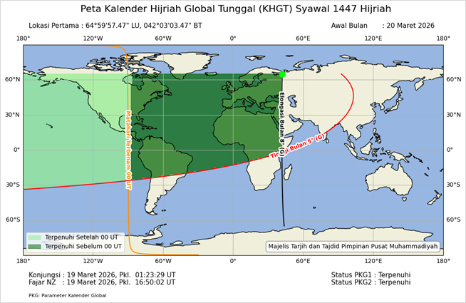 Menurut KHGT, konjungsi terjadi pada Pkl. 01:23:29 UTC tanggal 19 Maret 2026, ada lokasi dengan koordinat 64°59’57.47” lintang utara dan 42°03’03.47” bujur timur yang memenuhi kriteria, lokasi pertama yang memenuhi kriteria terjadi sebelum pkl. 00:00 UTC, sehingga PKG1 terpenuhi, maka 1 Syawal 1447 H menurut KHGT adalah tanggal 20 Maret 2026 M, seperti ditampilkan oleh Gambar 2.