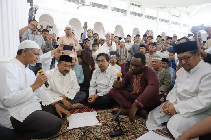 Selepas shalat Jumat, Micahel Walan mengucapkan dua kalimat syahadat di Masjid Jami Kopelma Darussalam Banda Aceh, Jumat (17/1/2020).